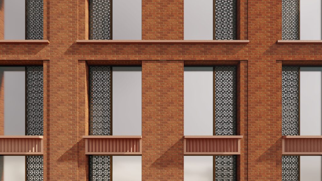 - A contextual material palette, with predominantly red brick complemented by stone and precast detailing.