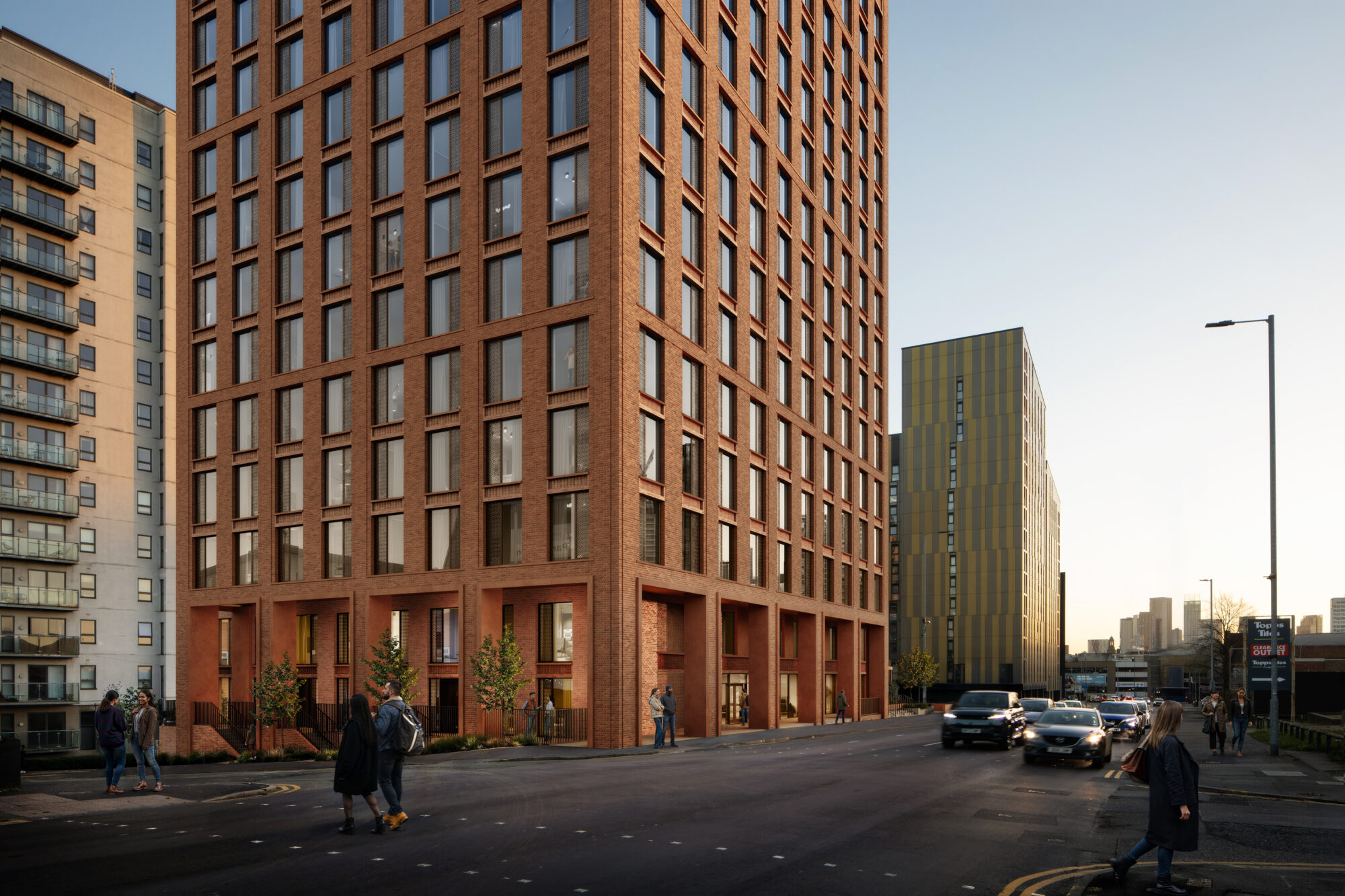 The final scheme delivers 251 high-quality, flexible homes in a stepped 24-storey building. Four townhouses at ground level engage directly with Lord Street, while the main block maximises dual-aspect apartments and open-plan layouts for modern, adaptable living.