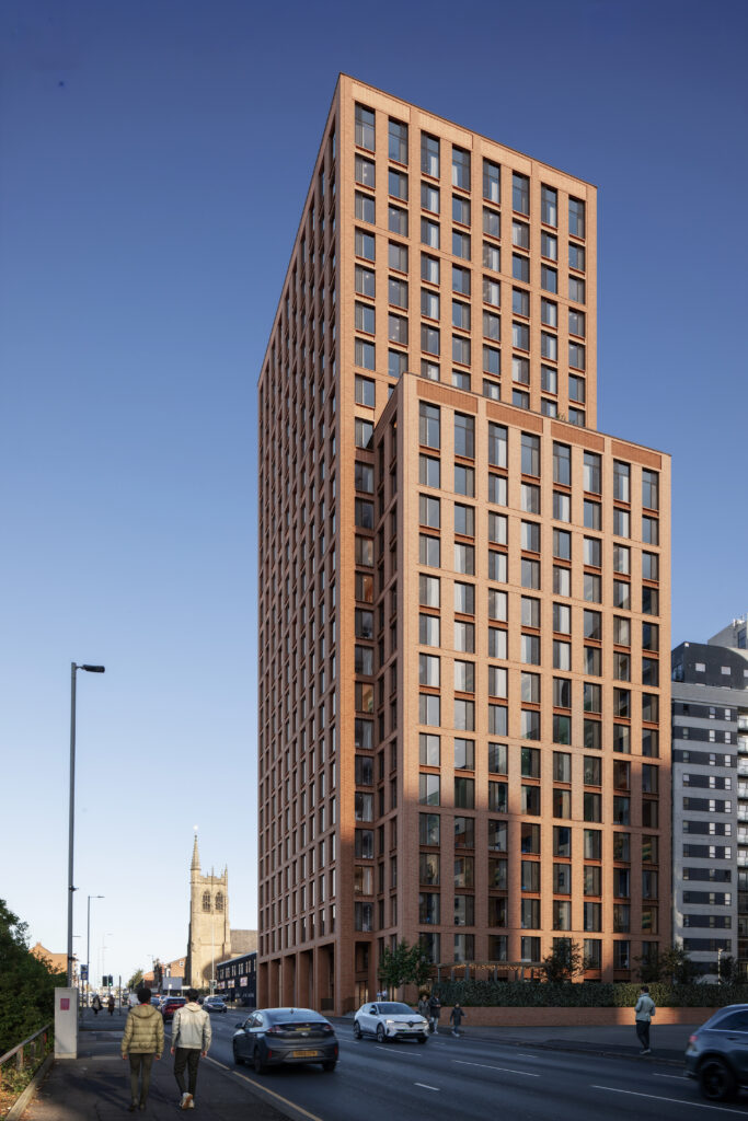 Previously home to retail and commercial units fronting Cheetham Hill Road, the site had seen planning for a 192-apartment scheme, but AEW was tasked with rethinking the potential to deliver more homes and a stronger civic presence.