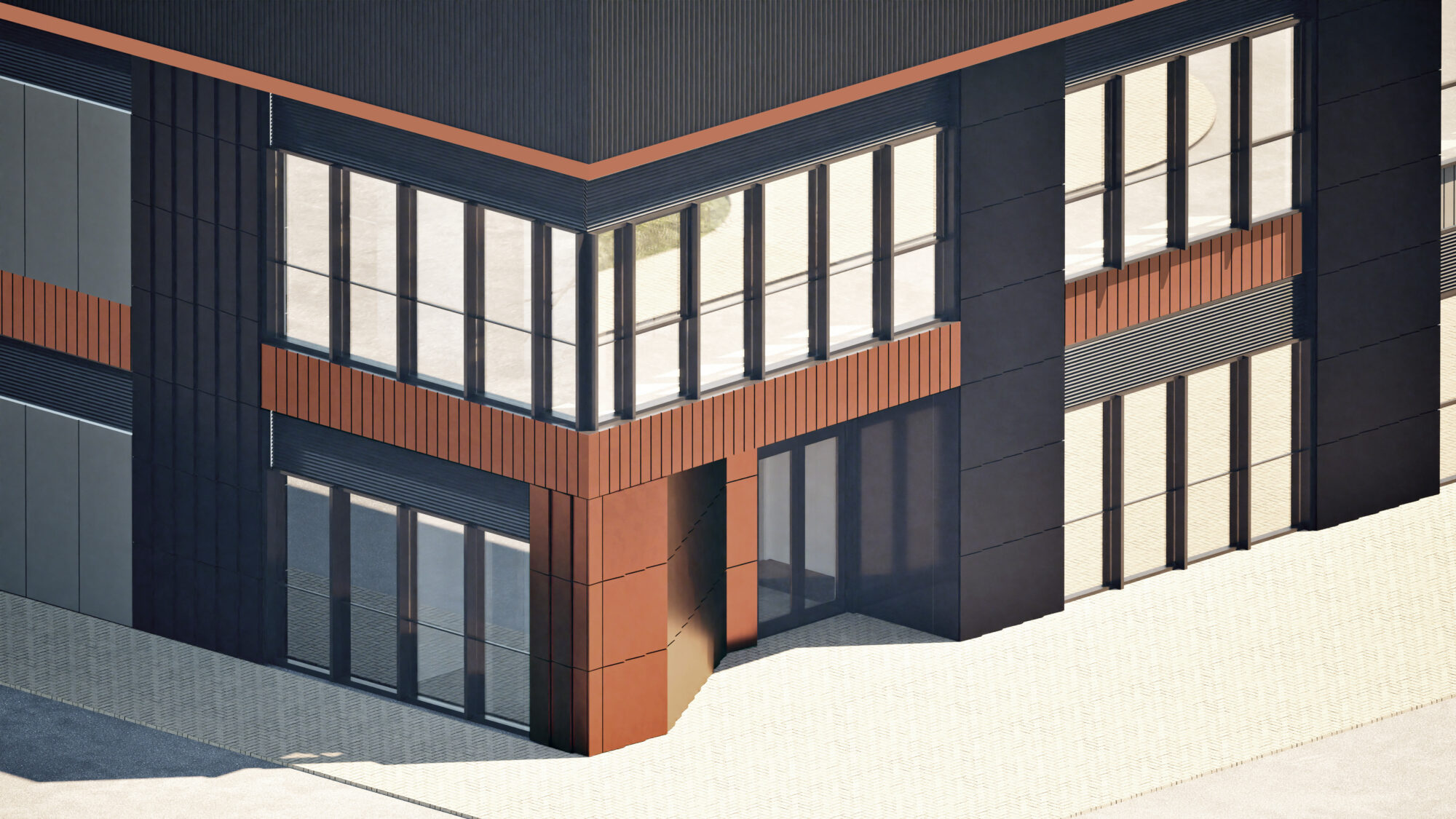 Architecturally, the scheme elevates the typical industrial typology through carefully considered materiality and articulation. Office frontages are expressed using high-quality cladding systems and refined detailing, creating a welcoming, campus-style environment, while the rear elevations maintain an efficient, industrial character. A considered colour palette draws on the red brick and terracotta tones of St Helens, reinforcing a strong sense of place and identity.